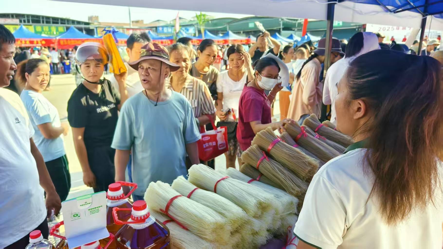 丰收的果实摆满了邕宁土货市场,百香果、红心番石榴、甜瓜、甘蔗、小青瓜、澳洲坚果等现场展示试吃,尝过的农民朋友纷纷点赞,并争相购买。淮山干粉、土猪肠、生榨粉等免费试吃,更有柠檬捞鸭、白切鸡等硬菜展示、品尝,真的是用一根牙签可以从第一摊品尝到最后一摊。